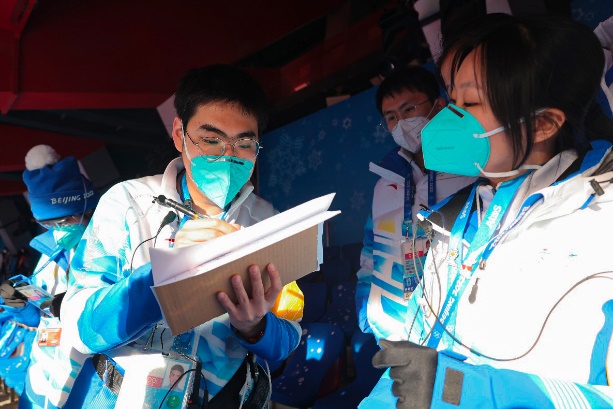 和每一个幕后平凡的岗位一样,闭环内赛事服务岗位上的“黄袖标”志愿者故事很多很多,其中不乏诸多令人感动的瞬间。这里既有寒风中道路两旁的坚守,也有辗转不同岗位的奔忙;既有手台里此起彼伏的口令,也有同服务对象反复不断的沟通提醒;既有国旗升起时油然而生的自豪,也有仪式落幕后送别友人的不舍。2月1日进入闭环至今,25位“黄袖标”志愿者们已度过了一多月的闭环生活,后续他们将继续为冬残奥会的开闭幕式运动员看台提供志愿服务。前后跨度两个多月的服务期内,几乎每一个人的岗位都发生着变化,但是手臂上明亮的“黄袖标”一直在提醒着这个团队中的每一个人,为冬奥会、冬残奥会四场重要仪式的国内外运动员提供高质量的志愿服务,展现当代中国青年的良好形象,是他们共同的追求。