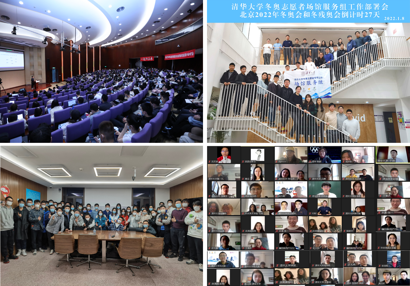 锤炼光荣使命意识,永葆昂扬精神风貌。为充分引导志愿者树立投身冬奥会的使命感、责任感和荣誉感,加强组织建设,场馆服务组在志愿者队伍中成立了9个临时党支部,由13位来自学生处、保卫处、科研院等部处的教师带队,选任优秀骨干志愿者担任支委,发挥模范带动作用和党支部战斗堡垒作用。依托党支部建设,做到“战前”充分培训动员、赛时每日调度部署:前期举办多场集中培训会、促进IKM平台课程学习,进行多次实地踏勘、模拟演练服务细节,助力志愿者掌握上岗必备知识储备和心理准备,有效提升实操应变能力;冬奥会开幕式后,各临时党支部第一时间召开总结交流会,复盘服务情况总结提升。服务于运动员看台的第九临时党支部与中央美术学院冬奥志愿者临时党支部闭环团队党小组在线举办联合组织生活,清华大学党委学生部部长、团委书记张婷,中央美术学院团委书记徐新立出席活动,经过开幕式锤炼的志愿者展现出良好的精神风貌,纷纷表达服务冬奥会的激动和自豪。