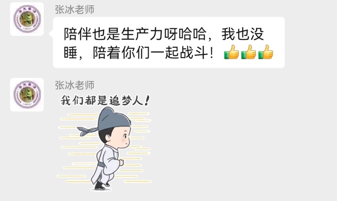 虽然在同学们的坚持下,张冰后来只是偶尔陪大家伙熬夜工作,但是他的心里还总是记挂着自己的学生,经常晚上睡不踏实。凌晨两点在群里给同学们送上温暖的鼓励,凌晨三点又在群里给同学们加油鼓劲,同学们总能感受到张冰时时刻刻的关心,就像他跟同学们说的那样,“陪伴也是生产力,我陪着你们一起战斗。”