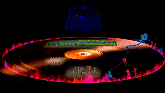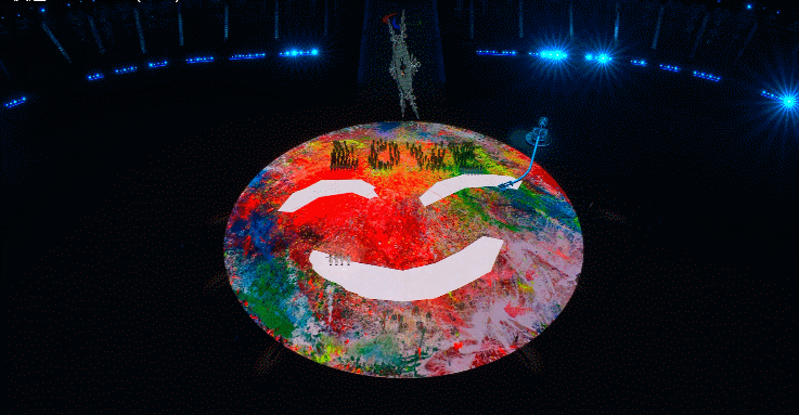 在冬残奥会的闭幕式舞台及表演空间的构建上,视效团队采用了圆形唱片的概念,作为冬残奥会这段时间记忆的存储载体贯穿始终。一方面,唱片机是一个重要的舞台演出空间支点,所有的闭幕式演出、仪式都会在圆形的唱片空间中演化完成。例如,入场仪式中唱片所形成的地球影像将所有各国残疾人运动员旗手纳入其中,展现出人类“共享地球、团结一心”的期望。另一方面,唱片机也是一个寄托追忆的空间载体,记录了冬残奥会上运动员们的高光时刻,以爱的感召呼唤一个残健融合的美好未来。在最后的熄火环节中,唱片机不断凝固本届冬残奥会的难忘回忆影像,展现出残疾人运动员拼搏向上、顽强奋斗的精彩瞬间。