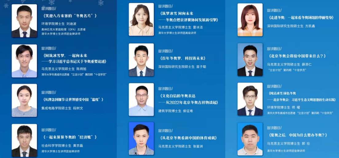 清华新闻网4月13日电 为充分利用冬奥重大契机,依托博士生讲师团宣讲专长,营造共迎冬奥的热烈氛围,展现清华冬奥志愿者风采,因势利导讲好中国故事,2021年12月,清华大学博士生讲师团在校党委宣传部、校党委研究生工作部、校团委的指导下,率先成立全国高校第一支“冬奥宣讲队”,宣讲冬奥主题“金课”、拍摄冬奥宣讲短视频,开展了一系列助力北京冬奥的宣讲活动,让青年之声在这场“和平友谊的盛会”“团结合作的盛会”“鼓舞世界的盛会”中不断回响。