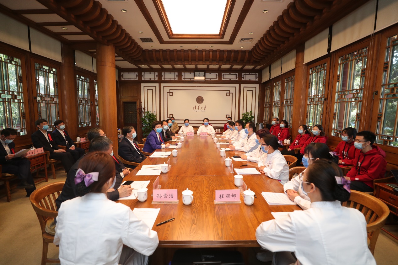 返京后,校领导与北京清华长庚医院支援武汉医疗队员开展座谈