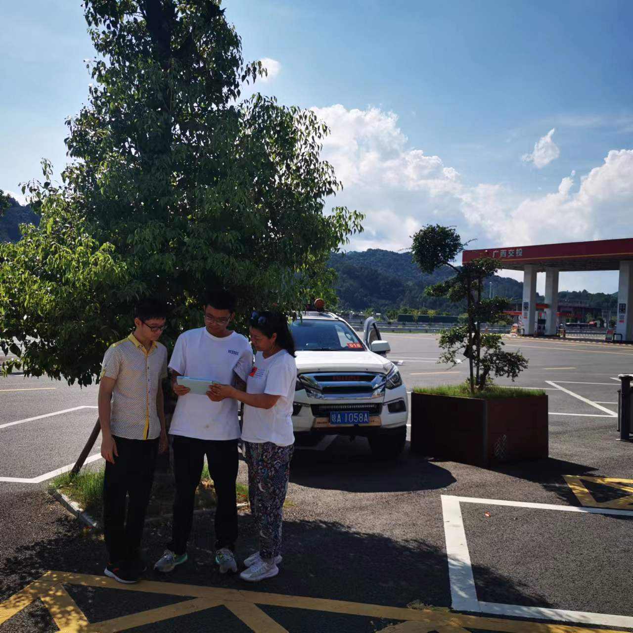 齐天下、孙有志和家长在高速服务站观看开学典礼