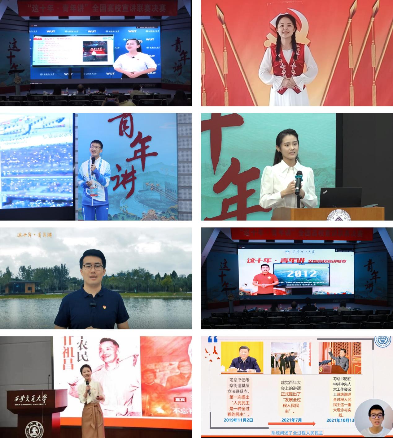 在决赛评比环节,清华大学环境学院博士生刘迪波以“一把椅子的故事”为题,分享了自己在北京冬奥会参与志愿服务工作期间与夏季奥林匹克项目国际单项体育联合会总会主席弗朗西斯科·里奇·比蒂建立的深厚友谊,记录了中国青年在构建人类命运共同体的背景下与世界相约的故事。长春大学特殊教育学院本科生王可闻从小便成长在无声的世界,她以“让生命之花绽放”为题,分享了自己从迷茫无助到站上冬残奥会开幕式舞台的成长经历。浙江大学公共管理学院硕士生耿昊以“让绿色成为你我的生活底色——践行‘两山理论’,传承‘绿色火炬’”为题,讲述了一位传递绿色火炬的火炬手“老汪”的动人故事,展现了守护生态环境的责任在两代青年间的传承。武汉理工大学马克思主义学院硕士生黄莺以“这十年,教育照亮我前行的路”为题,分享了自己作为视障者在求学路上“除了看不见,什么都能做”,最终实现梦想的故事。合肥工业大学仪器科学与光电工程学院哈萨克族本科生古丽达娜·奴尔金俄斯来自新疆伊犁尼勒克县,她以“让每一个古丽,都像我一样达娜”为题,讲述了她与支教的刘晓玲老师建立的浓浓的师生情,号召各民族青年把青春奋斗融入党和人民事业中。华南理工大学材料科学与工程学院硕士生李爽杰以“在希望的田野上”为题,分享了自己在广西支教时的所见所想,描绘了一幅青年们将希望播撒在田野上,助力乡村居民生活不断改善的美好图景。西安交通大学新闻与新媒体学院硕士生赵睿妮以“灯火荧荧,一路前行”为题,讲述了自己在个人发展、学校发展、城市进步、国家富强等方面的故事与感想,展现出了新时代青年永不懈怠的奋斗姿态。重庆大学新闻学院本科生李冼卡特以“民主文明的新形态:全过程人民民主的内涵”为题,向听众们生动阐述“全过程人民民主”的理论内涵。