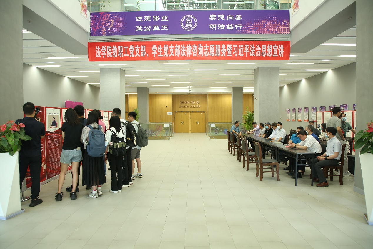 清华新闻网6月19日电 6月15日下午,为扎实开展学习贯彻习近平新时代中国特色社会主义思想主题教育,认真贯彻落实习近平法治思想,紧扣“我为群众办实事”实践活动要求,根据法学院主题教育安排,法学院教职工第一、第二党支部、法博21党支部、法2党支部充分发挥专业优势,在法律图书馆一楼大厅联合开展法律咨询志愿服务暨习近平法治思想宣讲。法学院党委书记邓海峰、党委副书记陈杭平等师生到场参加活动。