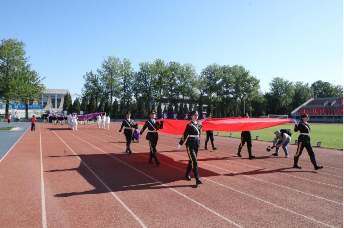 全部方阵入场完毕后,主席台的领导和嘉宾及看台上的观众全体起立,绿茵地上的师生校友们集体向右转,蓝天之下,大家一同面向升旗台,在军乐队激昂的乐声中,举行了隆重而庄严的升国旗仪式。