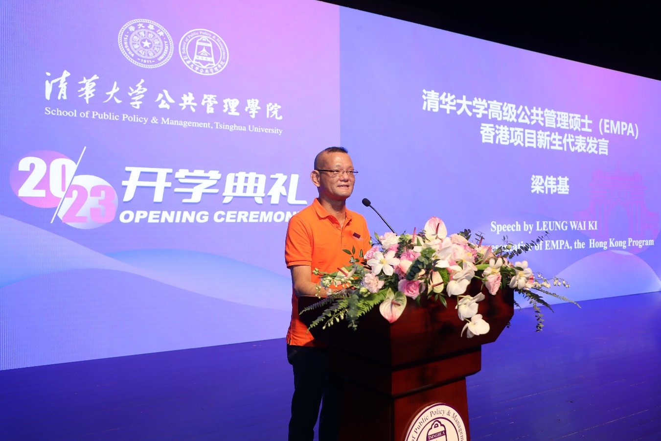 2023级清华大学高级公共管理硕士(EMPA)香港项目新生代表梁伟基发言。梁伟基现任香港警务处高级警司,他希望在学习中增补知识,修身立德,达致校训中“自强不息、厚德载物”的君子之道,实现院训中的“明德为公”精神,为实现民族、国家和香港的更大辉煌贡献力量。