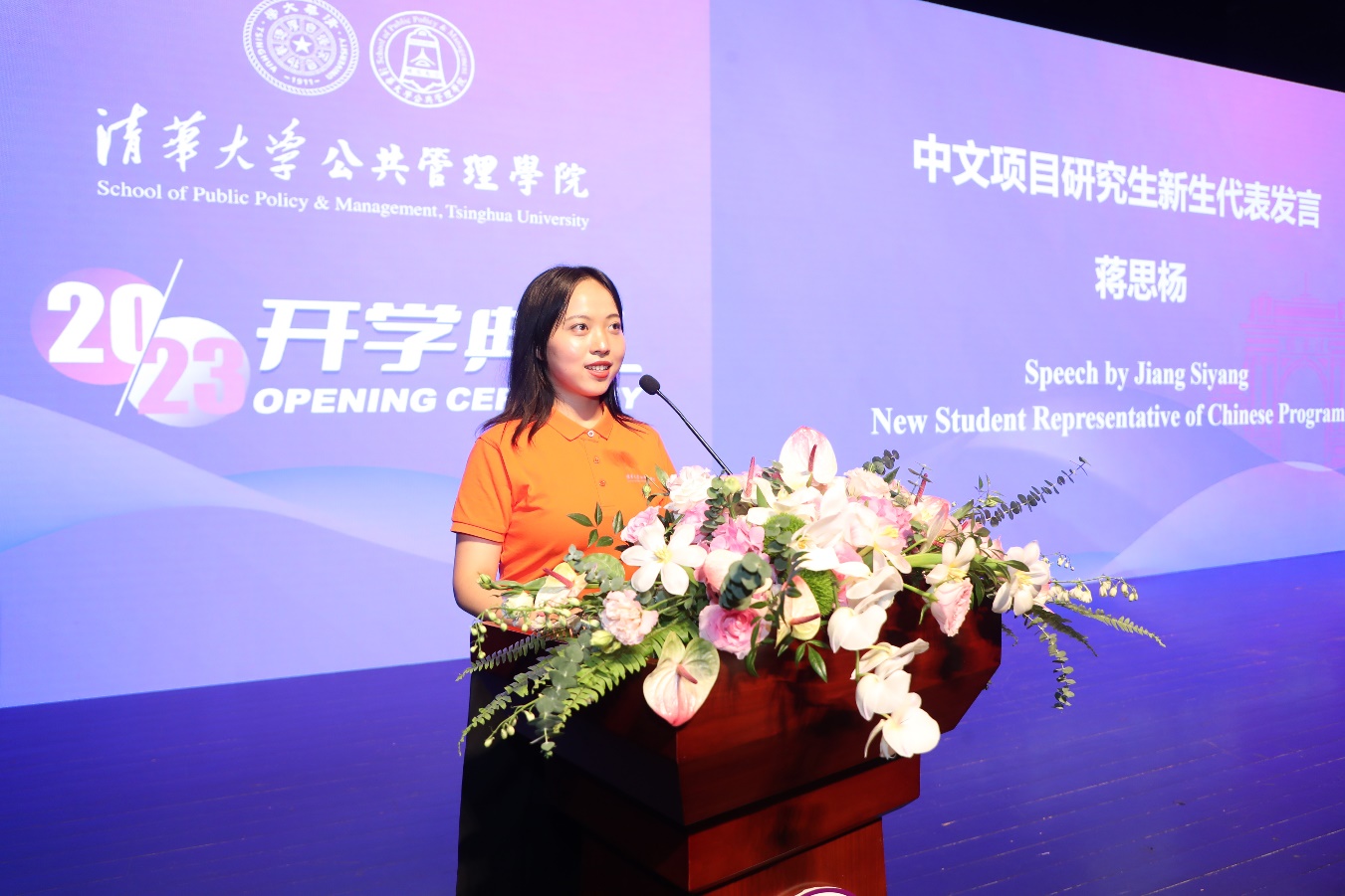 2023级中文项目新生代表蒋思杨发言。蒋思杨曾获得清华大学学生社会实践金奖个人,将继续在公管学院攻读博士学位。她认为与清华公管相遇是一种运气,但是还要寻找另外三种气:一是在时代洪流中站稳脚跟,培养扎根现实的底气;二是在被拒绝和被否定时坚定信心,锤炼保持希望的勇气;三是从高手如云的环境里汲取养分,始终怀有谦逊敬畏的服气。