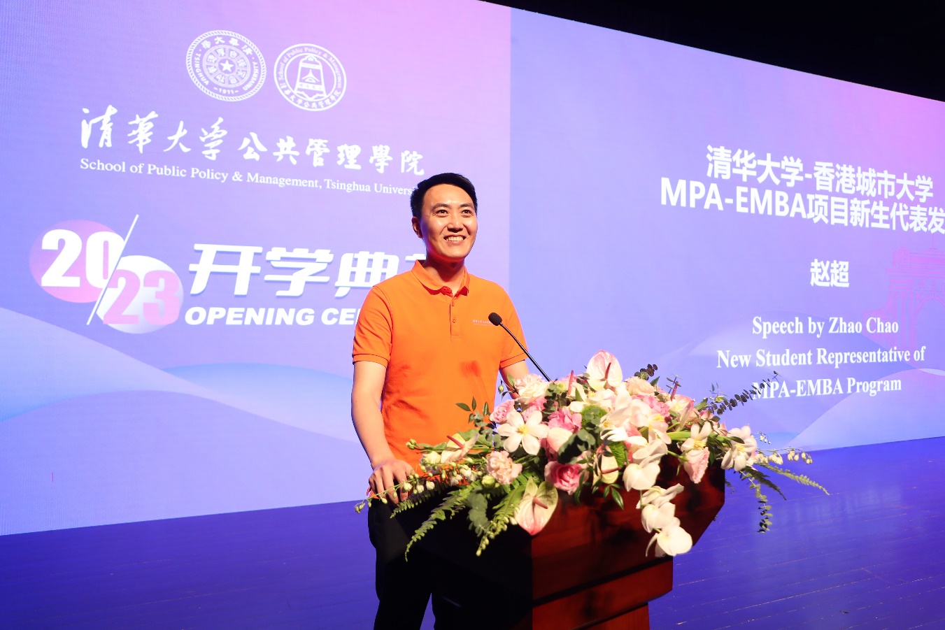 2023级清华大学-香港城市大学MPA-EMBA项目新生代表赵超发言。赵超是一名金融行业从业者,他表示,今年是“一带一路”倡议提出十周年,在下一个十年,希望大家能够贡献自己学习到的知识,砥砺奋进,助推沿线国家和地区繁荣进步。