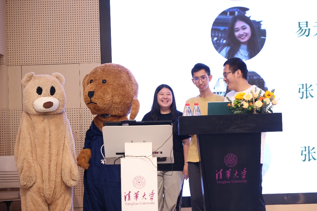 结课汇报现场,小组同学扮演的“抱抱熊”和在场师生互动。(小组同学:郭浩然、何书恒、易元淮、张雨萌、张芹婧)
