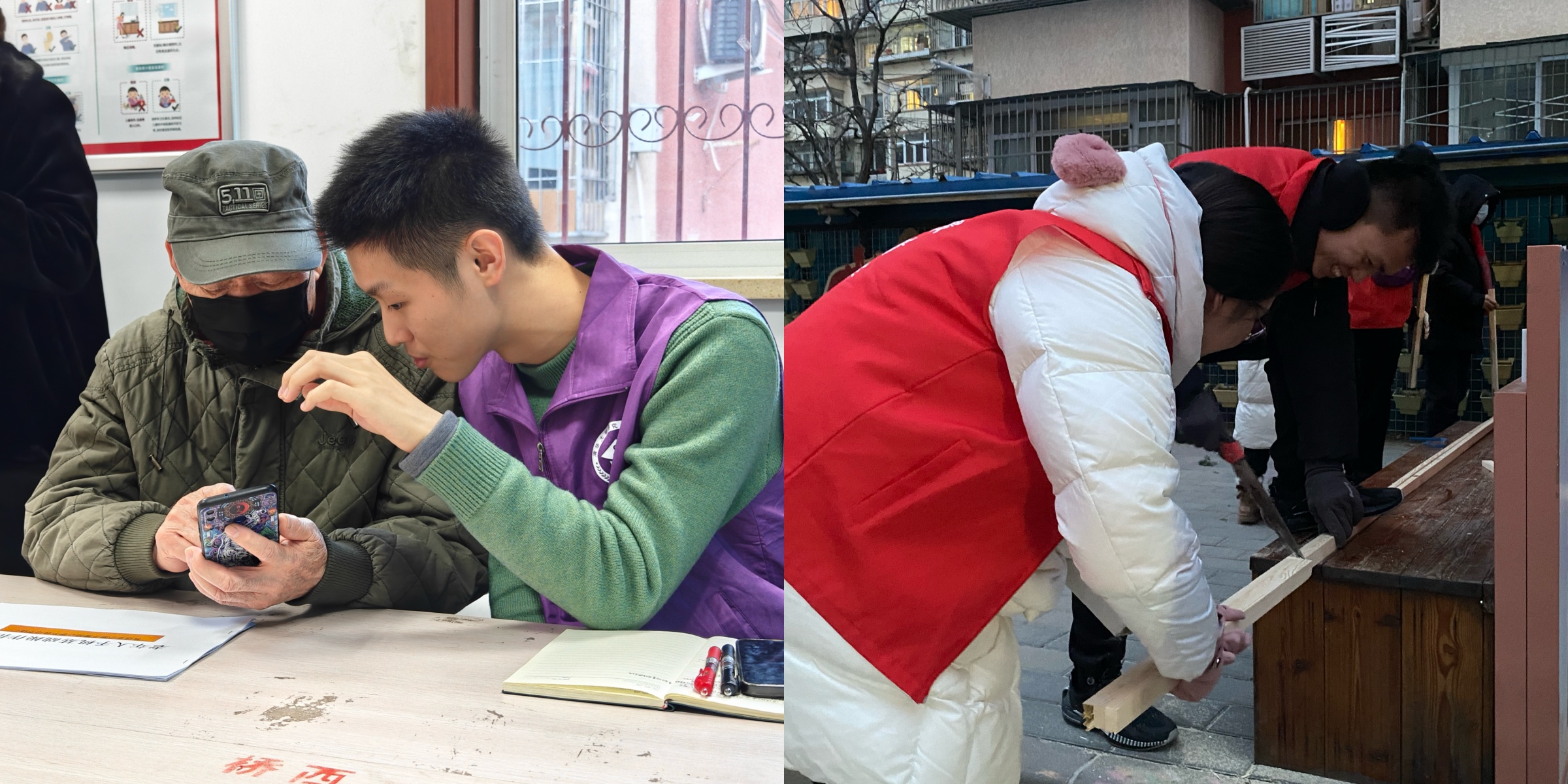 社区助老跟时代,劳动锻炼正当时。前期调研得知,在智能手机App的使用上,社区老人普遍较为困惑。法学院的同学们搜集整理并印制数份《老年人手机操作指南》,分发给社区老人,并以“基础操作+进阶App操作”进行阶梯式讲解和手把手教学。去年冬日,同学们还参与了社区环境养护工作,修剪和清理社区花园中的草木,与社区居民、志愿者一起搭建保温棚,以待春季种植花卉。