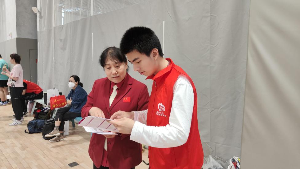 校友乒乓球比赛志愿者与工作人员核对活动流程安排