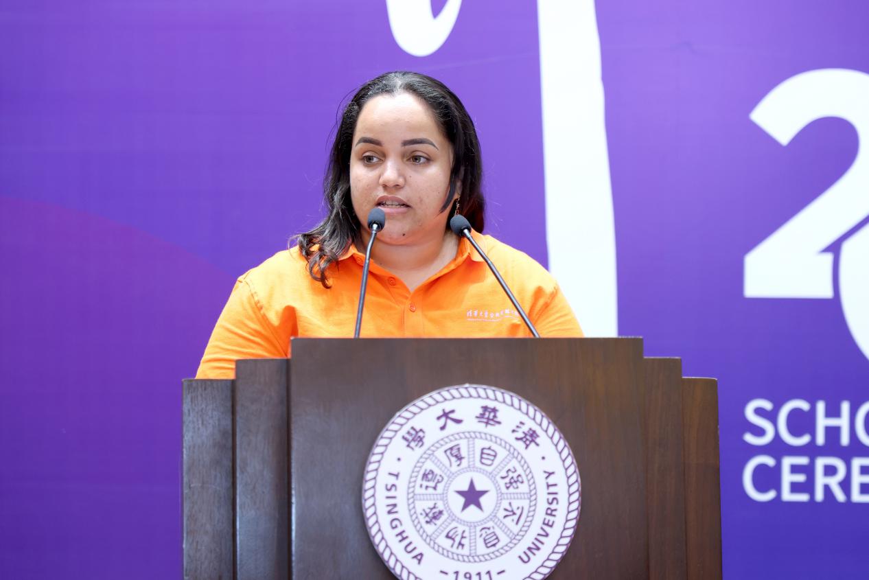 2024级留学生新生代表玛丽亚·帕亚诺(María Payano)发言。她表示,作为清华大学公共管理学院的第一位多米尼加学生,感到无比自豪和荣幸。在公管学院,同学们能够构建理解、合作和相互尊重的桥梁,更好地以全球视角看待我们今天面临的复杂挑战。