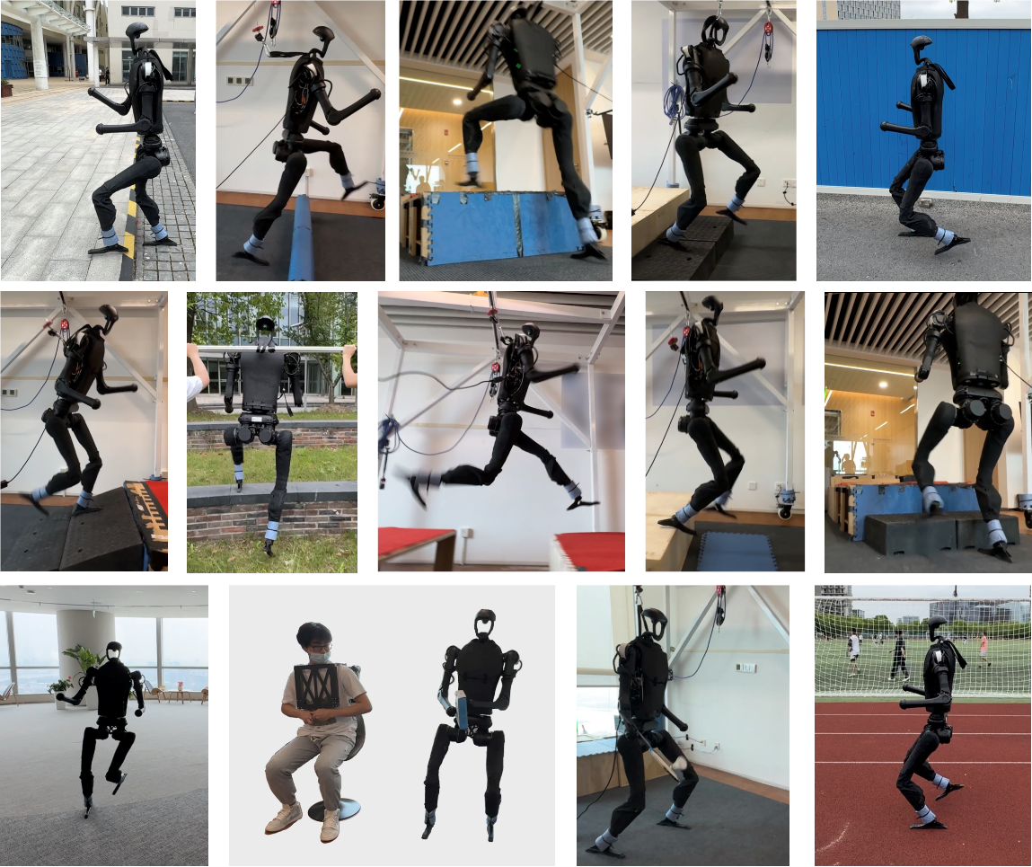 通过这一策略,人形机器人能够轻松应对各种跑酷挑战,如从0.42米高的平台上起跳、越过障碍以及跨越0.8米高的间隙等。该机器人还能在野外以1.8米/秒的速度奔跑,并在不同的复杂地形上保持稳健的行走能力,以穿越具有挑战性的现实世界环境。