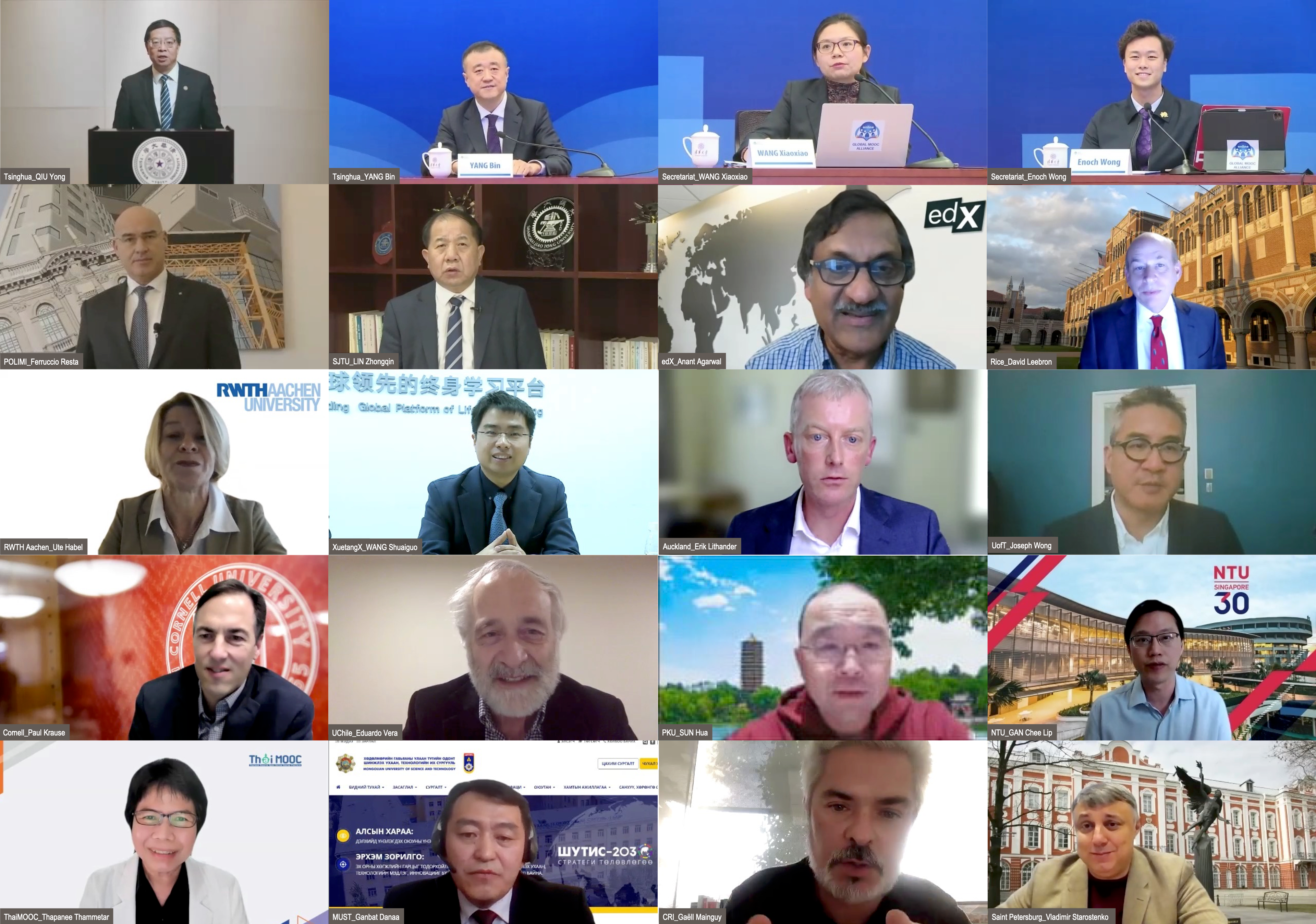 12月2日-3日,世界慕课联盟(Global MOOC Alliance)理事会在线拉开帷幕。理事会由12月2日下午及12月3日上午两场会议组成,来自六大洲14个国家的联盟理事会及执行委员会成员代表共同参会。