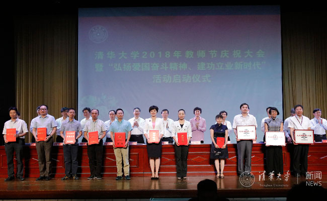 2018.099月7日下午,在第34个教师节即将来临之际,清华大学在大礼堂举行教师节庆祝大会,表彰在教书育人等各项工作中取得突出成绩的教师和集体,学习新时代优秀知识分子的先进事迹。“弘扬爱国奋斗精神、建功立业新时代”活动启动仪式同时举行。校领导邱勇、陈旭、姜胜耀、薛其坤、吉俊民、杨斌、李一兵、王希勤、郑力,校党委常委、工会主席王岩,校党委常委、组织部部长许庆红出席会议。
