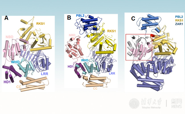 2019.04清华大学柴继杰团队、中国科学院遗传与发育生物学研究所周俭民团队、以及清华大学王宏伟团队最近的联合研究,在植物免疫研究领域取得历史性的重大突破。合作团队发现由抗病蛋白组成的抗病小体并解析了其处于抑制状态、中间状态及五聚体活化状态的冷冻电镜结构,从而揭示了抗病蛋白管控和激活的核心分子机制。