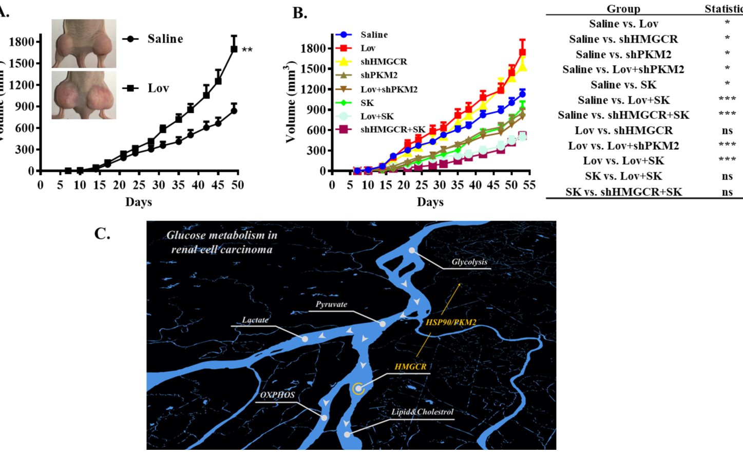 近日,深圳国际研究生院弥胜利课题组的研究证明,虽然肾癌细胞中胆固醇合成限速酶HMGCR受抑制后导致荷瘤小鼠模型血清胆固醇降低,但RCC肿瘤组织内糖酵解增强,乳酸积累增多,微血管被诱导生成,导致RCC肿瘤加速发展。其潜在机制为HMGCR调节热休克蛋白HSP90...