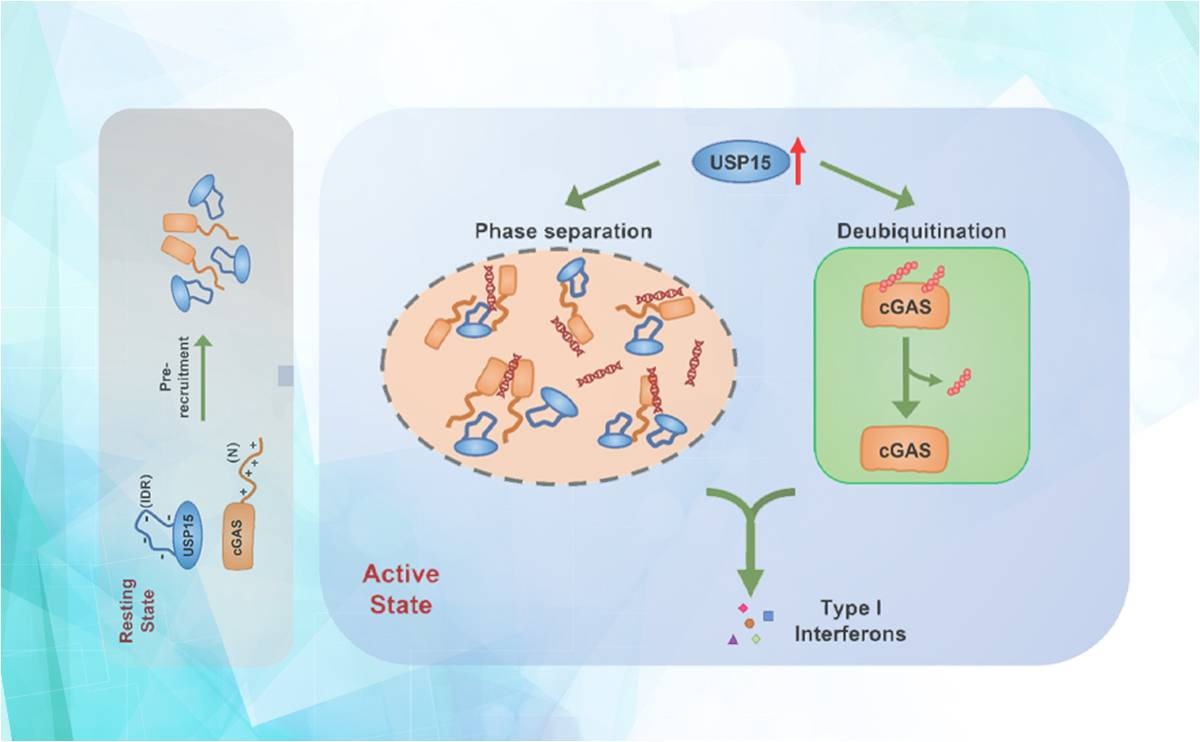 近日,清华大学药学院尹航教授课题组研究发现去泛素化酶USP15作为cGAS的相互作用蛋白,可通过去泛素化和相分离两种方式共同促进激活cGAS介导的天然免疫信号通路,为cGAS为靶点的抗病毒药物研发提供了新思路。