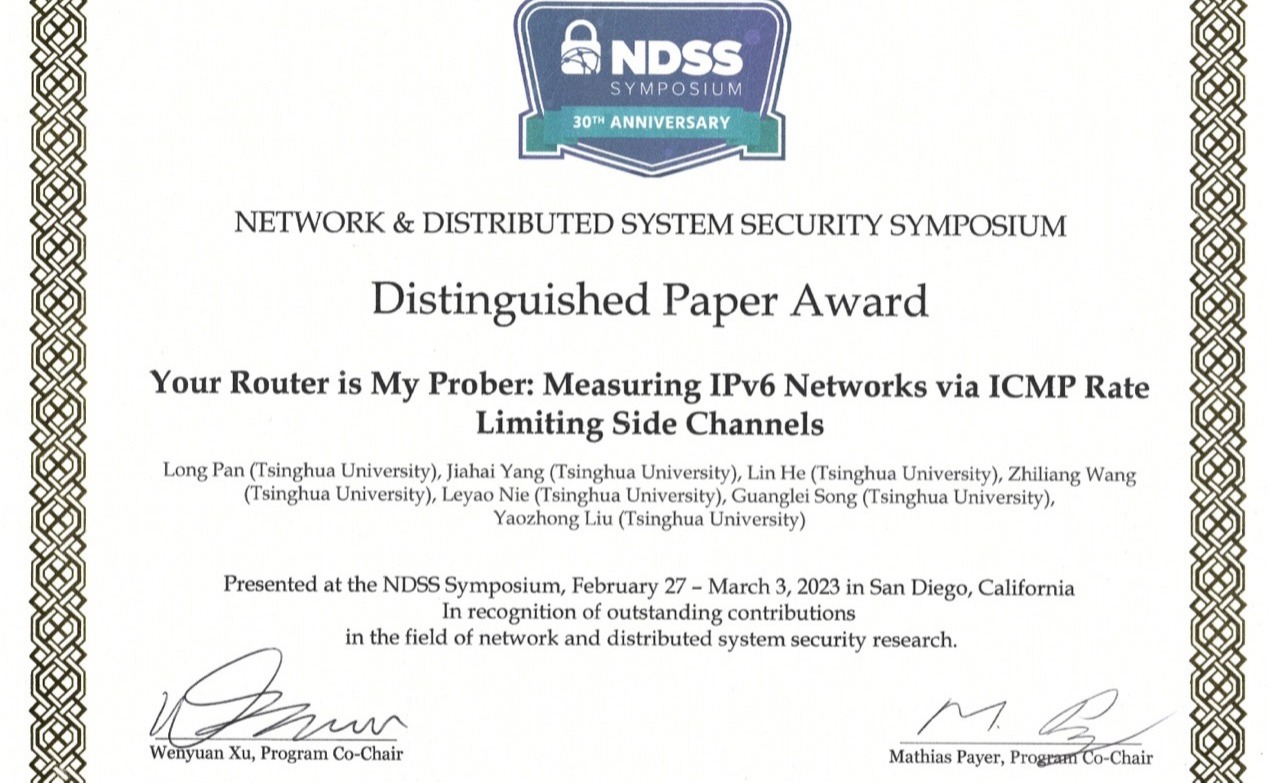 2023.03网络研究院杨家海团队获得第三十届网络与分布式系统安全研讨会杰出论文奖