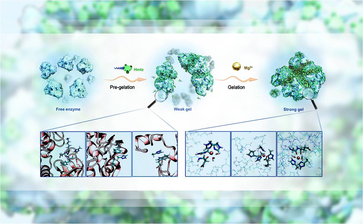 近日,清华大学化工系王玉军课题组与中国科学院天津工业生物技术研究所孙周通课题组合作,通过三唑类分子和金属离子的多位点协同桥接作用,实现了诱导醇脱氢酶自聚形成具有高活性和稳定性的多孔水凝胶,填补了领域内对基于弱作用的无载体固定化酶研究的空白。