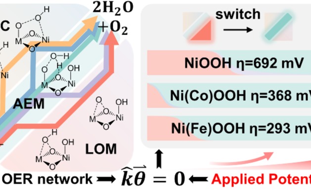 近日,清华大学化学系肖海副教授课题组在电催化析氧反应(OER)机理的基础研究中取得新进展。结合巨正则系综理论计算和微观动动力学模拟,发现在层状双氢氧化物(LDH)结构的镍基羟基氧化物(Ni(M)OOH)催化剂上,OER反应由三种类型的机理组成一个耦合的复...