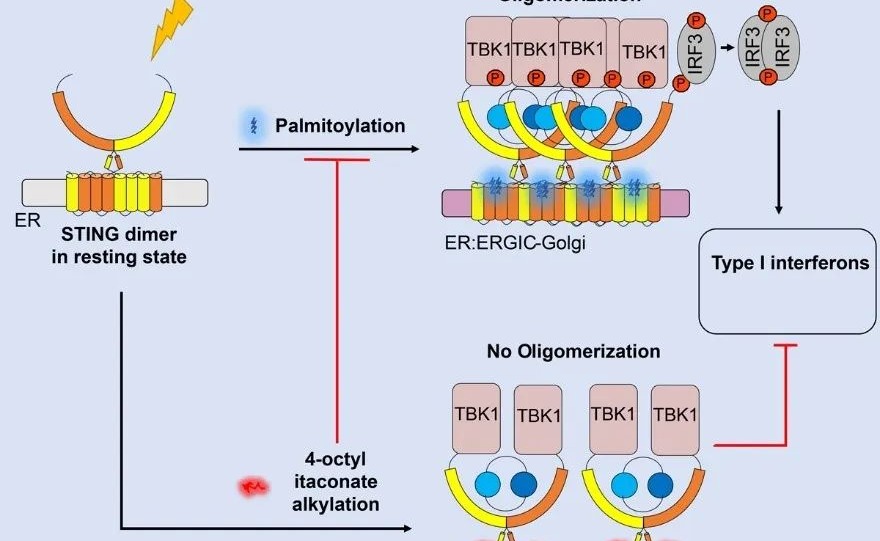 近日,清华大学药学院尹航课题组发现衣康酸的衍生物4-辛基衣康酸(4-Octyl itaconate, 4-OI)能够直接烷基化修饰STING的Cys91,从而阻断了STING Cys91位点的棕榈化修饰,抑制了STING的寡聚和下游信号的激活。