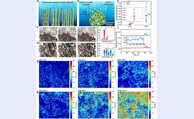 近日,清华大学深圳国际研究生院杨诚团队报道了一种独特的层状蕨类合金气凝胶(LFA)作为自支撑电极,具有独特的动态自适应排气性,可以有效避免气泡聚集引起的应力集中。LFA电极本质上具有高催化活性,并显示出高度多孔,弹性,分层有序和良好渗透的导电...