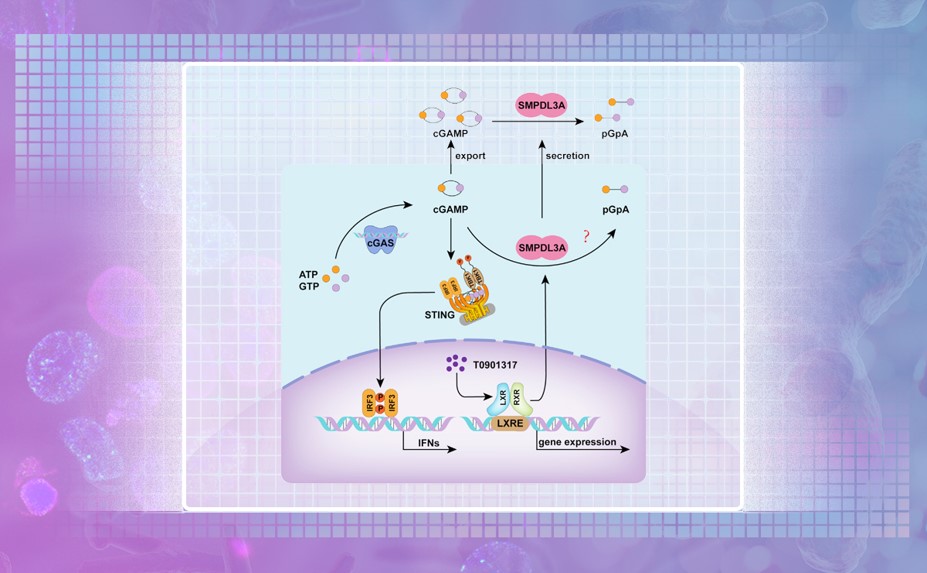 近期,药学院张从刚课题组发现肝X受体(liver X receptor, LXR)脂代谢通路的激动剂(T0901317等)能够诱导一种酶SMPDL3A的表达,该酶能够特异性地降解cGAS-STING信号通路的第二信使2’3’-cGAMP,从而特异性地抑制cGAS-STING天然免疫通路的激活。