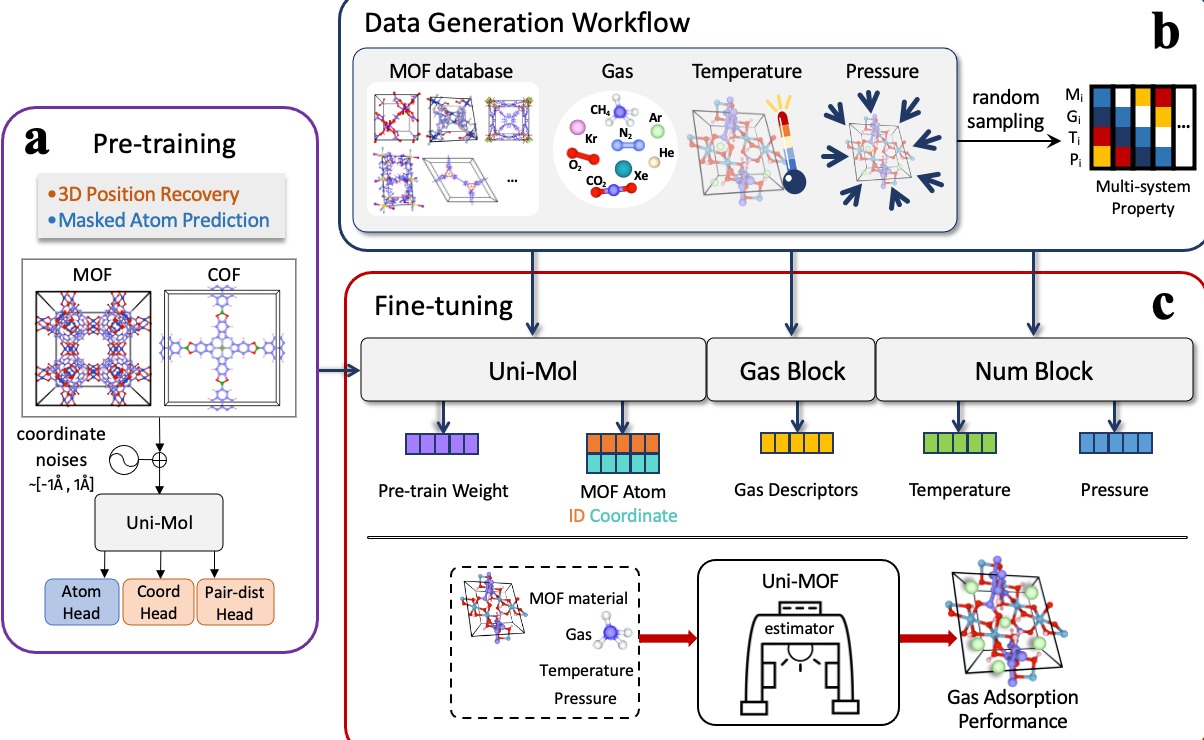 近日,清华大学化工系卢滇楠教授团队联合美国加州大学河滨分校吴建中教授和北京科学智能研究院高志锋研究员研发出三维MOF材料吸附行为的机器学习模型Uni-MOF,用于预测各类工况下纳米多孔材料对各类气体的吸附性能。