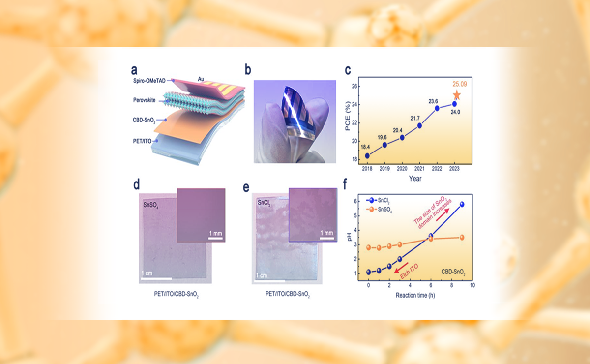 近日,清华大学电机系易陈谊研究员团队通过开发可适用于柔性衬底的化学水浴制备二氧化锡(SnO2)电子传输层工艺实现了25.09%(认证效率为24.90%)的柔性钙钛矿太阳能电池的世界最高效率纪录。