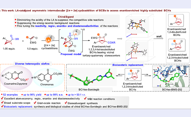 近日,清华大学深圳国际研究生院生物医药与健康工程研究院林进顺团队与南方科技大学刘心元团队携手发展了路易斯酸催化双环[1.1.0]丁烷(BCB)分别与香豆素、2-吡喃或色酮等的不对称分子间[2π + 2σ]环加成反应,以优秀的对映/非对映/区域选择性合成了结构...