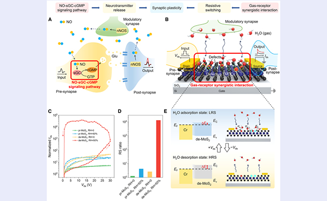 受生物“气体-受体”信号通路的启发,清华大学材料学院刘锴副教授团队与谷林教授团队合作,提出了一种气体(H2O)-受体(缺陷)协同作用机制,使MoS2横向忆阻器阻变比提升了超过10000倍。