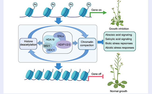 2025.04生物医学交叉研究院何新建实验室揭示拟南芥组蛋白乙酰化酶复合体中的被子植物特异亚基作用的分子机制