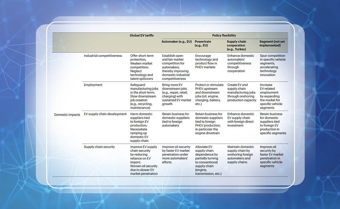 近日,清华大学车辆与运载学院师生及合作者提炼了当前全球电动汽车关税的四类灵活性机制,并分析了其在本国产业竞争力、全球低碳转型等八个国内/国际影响维度下的作用机理。