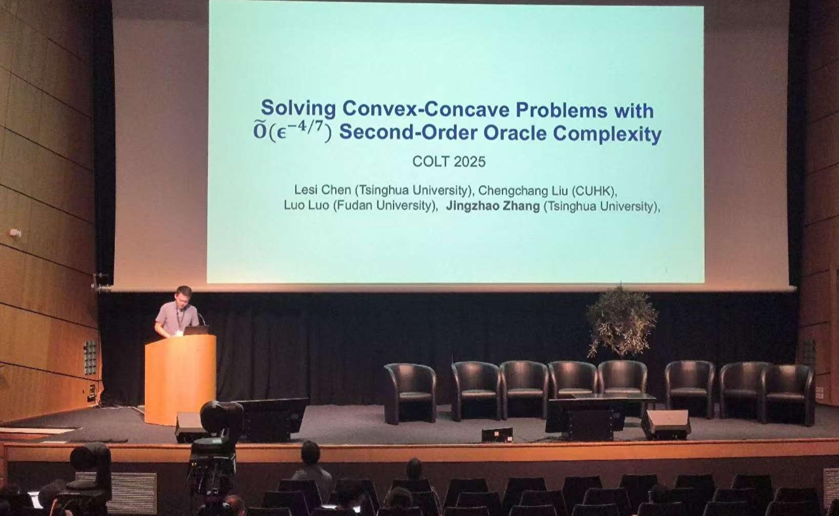 近日,清华大学交叉信息研究院博士生陈乐偲和张景昭助理教授的科研成果“求解二阶Oracle复杂度的凹凸问题”(Solving Convex-Concave Problems with 20250707-国际顶会COLT2025-摄影未知-公式1.pngSecond-Order Oracle Complexity)在机器学习理论的国际顶...