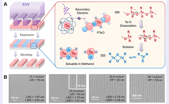 近日,清华大学化学系许华平教授团队在极紫外(EUV)光刻材料上取得重要进展,开发出一种基于聚碲氧烷(Polytelluoxane, PTeO)的新型光刻胶,为先进半导体制造中的关键材料提供了新的设计策略。