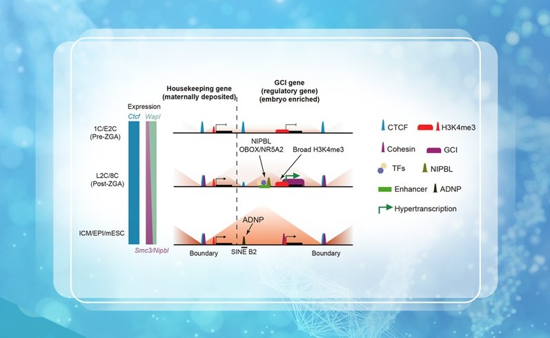2025.08生命学院颉伟课题组揭示哺乳动物早期胚胎中染色质高级结构重建与胚胎超转录机制及相互促进关系