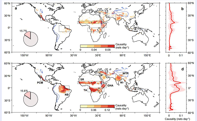 清华大学地学系阳坤教授课题组揭示了全球表层土壤湿度-降水(SSM-P)强因果热点区域及其耦合路径,并应用于评估主流气候模式在陆气耦合方面的模拟性能。