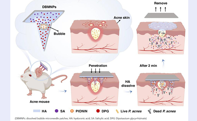 近日,清华大学深圳国际研究生院张灿阳副教授团队研发了一种可溶气泡微针贴片(DBMNPs),实现了多种亲/疏水药物的空间分隔负载与时序控制释放,成功破解了可溶微针共负载和共递送亲/疏水药物,同时实现杀菌与抑制炎症的难题。