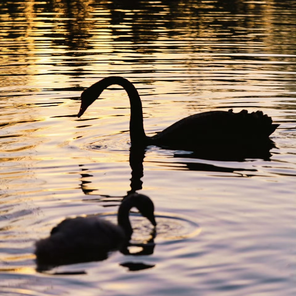 黑天鹅悠然游弋,与波光粼粼的水面相映成趣