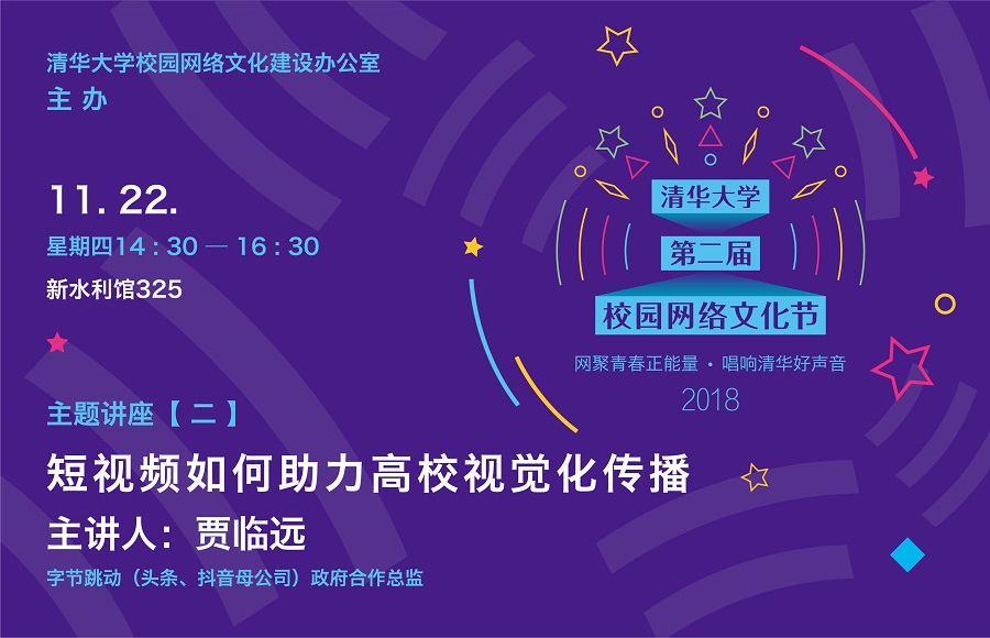 清华大学校园网络文化建设办公室举办“短视频如何助力高校视觉化传播”主题讲座。本次讲座系“2018清华大学第二届校园网络文化节”第二场讲座活动。第二届网络文化节围绕“网聚清楚正能量 唱响清华好声音”主题,于11月—12月期间举办系列主题讲座、沙龙活动以及网络优秀作品评选活动。