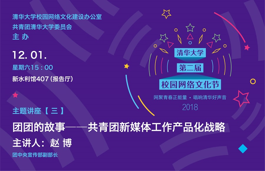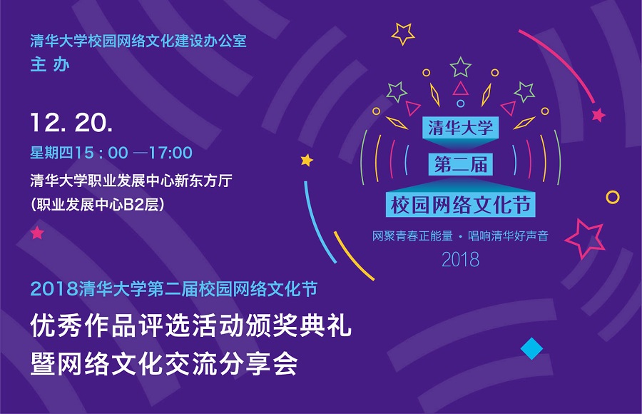 2018清华大学第二届网络文化节围绕“网聚清楚正能量 唱响清华好声音”主题,于11月—12月期间举办系列主题讲座、沙龙活动以及网络优秀作品评选活动。